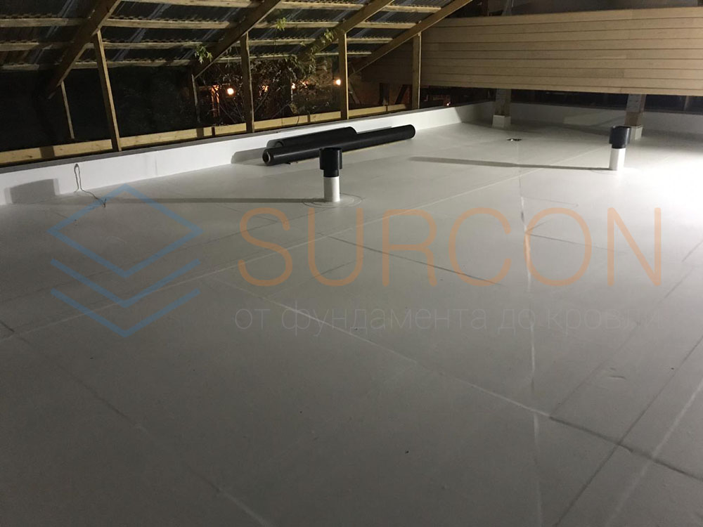 Используемая гидроизоляция: ТПО мембрана Carlisle 1.52 мм, клеевая система монтажа, основа — фанера